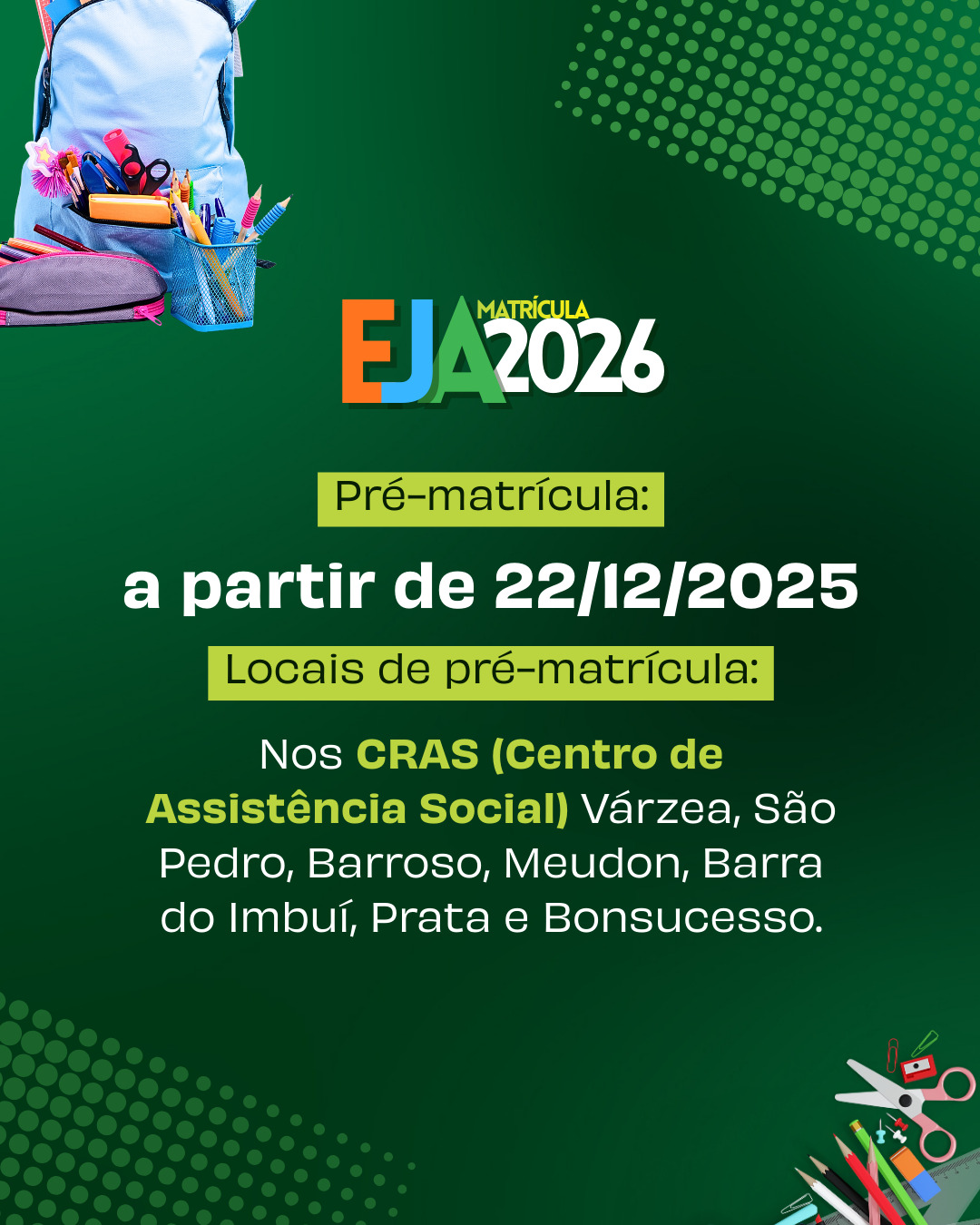 A Secretaria Municipal de Educação inicia, no próximo dia 22, a Pré-matrícula 2026 para a EJA (Educação de Jovens e Adultos). Serão disponibilizadas vagas do 1.ª ao 9.ª ano da modalidade para o CEROM (Centro Educacional Roger Malhardes), em São Pedro, e para o CEBES (Centro Educacional Beatriz Silva), na Barra do Imbuí. A EJA é voltada para pessoas a partir de 15 anos completos, inclusive para os trabalhadores que pretendem retornar a estudar. As pré-matrículas podem ser feitas nos CRAS (Centros de Assistência Social), de segunda a sexta, das 8h às 17h.