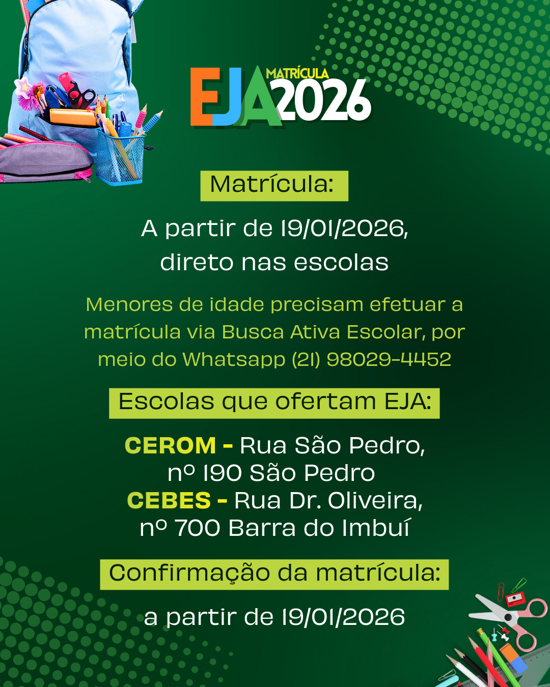 A matrícula poderá ser realizada a partir do dia 19 de janeiro de 2026, diretamente nas escolas que oferecem a EJA: CEROM e CEBES.