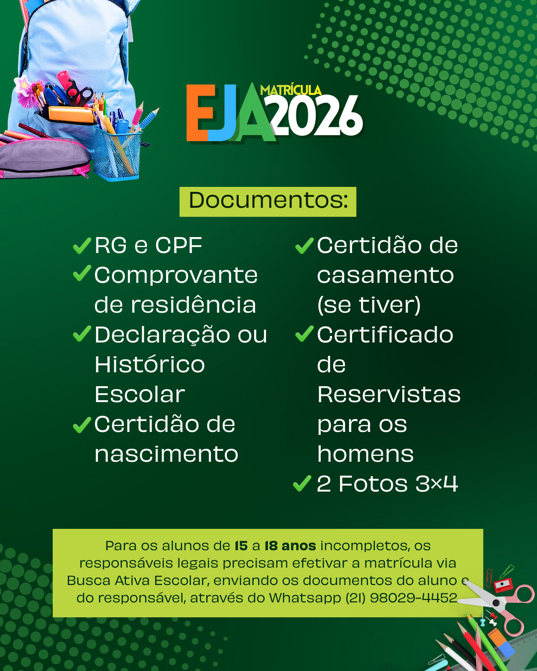 Para os alunos de 15 a 17 anos, os responsáveis legais precisam efetivar a matrícula por meio do WhatsApp do programa Busca Ativa Escolar, enviando os documentos do aluno e do responsável: (21) 98029-4452.