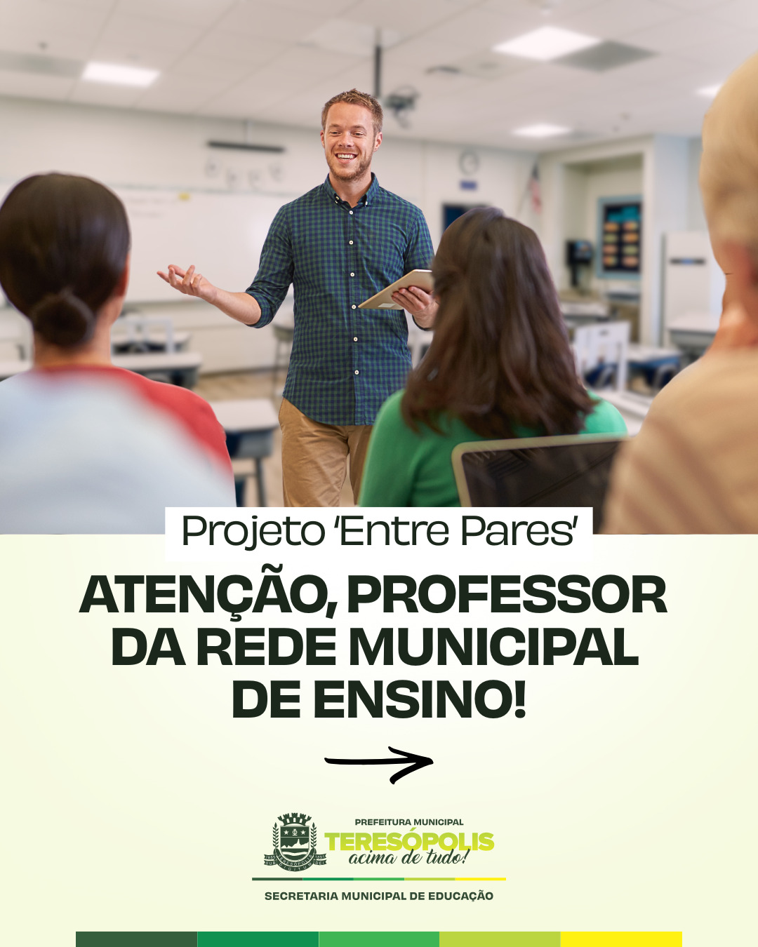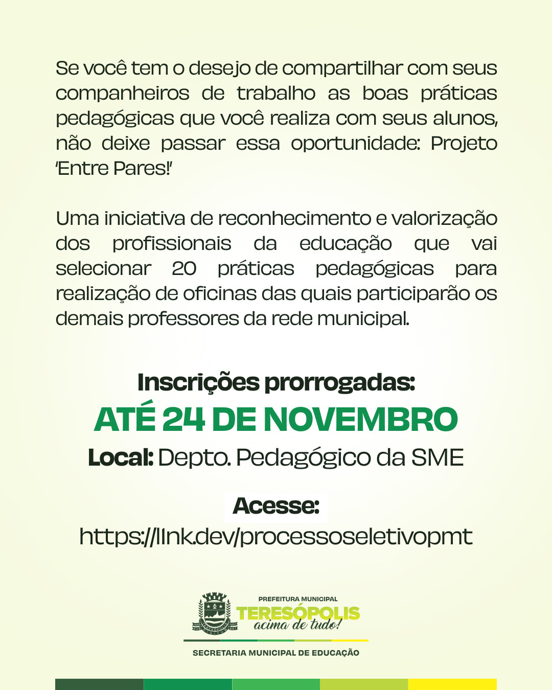 Os professores da Rede Municipal de Ensino de Teresópolis têm até o próximo dia 24 para se inscrever no programa de formação continuada ‘Entre Pares’. A iniciativa reconhece e valoriza a educação de qualidade, protagonizada por professores das creches ao 9º ano do Ensino Fundamental, com o objetivo de destacar, entre os trabalhos inscritos, 20 práticas pedagógicas que estimulam o desenvolvimento integral, que evidenciem, exemplifiquem e inspirem outros profissionais da educação do município. Serão selecionados os 20 projetos, considerando a pertinência aos eixos temáticos propostos no edital (https://l1nk.dev/processoseletivopmt), para realização de oficinas das quais participarão os demais professores da rede municipal. As inscrições devem ser feitas no Departamento Pedagógico, na sede da SME.