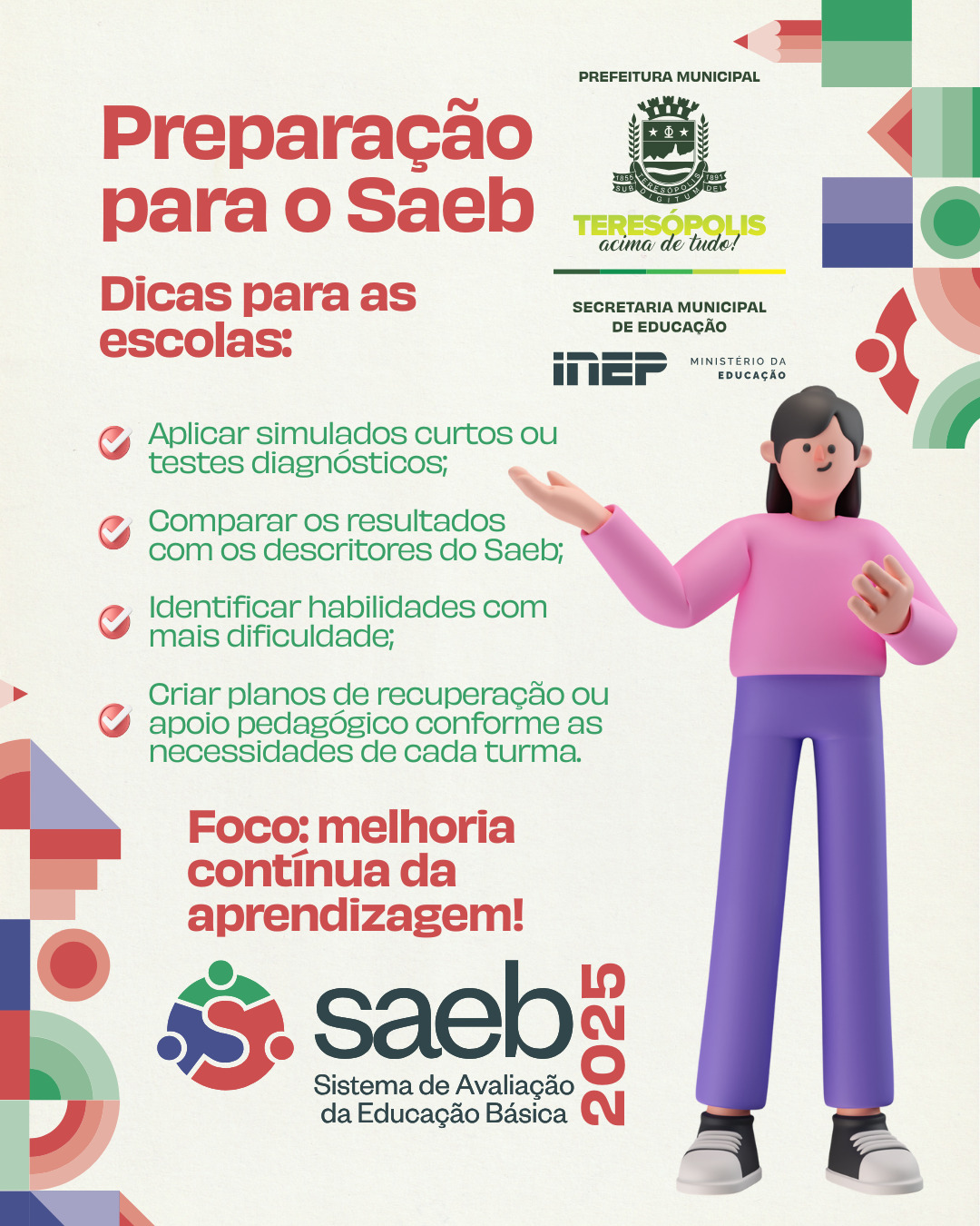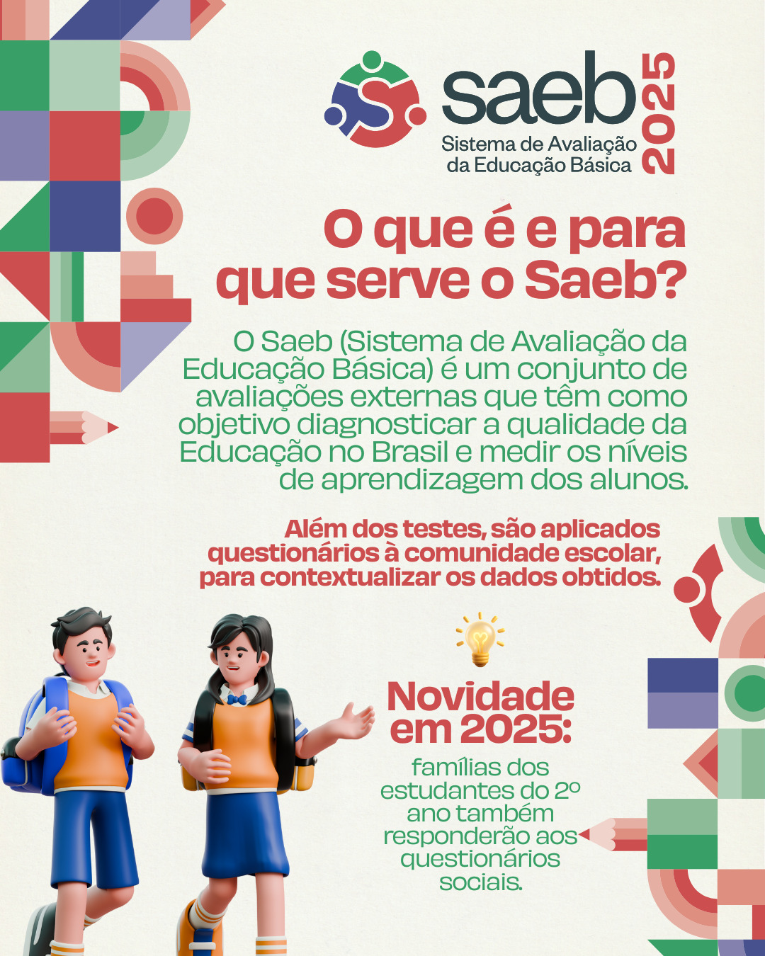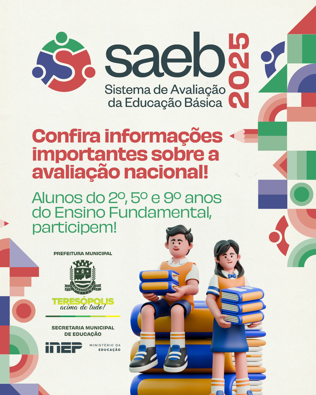 A Secretaria Municipal de Educação segue com o movimento de mobilizar os alunos do 2º, 5º e 9º anos do Ensino Fundamental para que participem do Saeb 2025. O Sistema de Avaliação da Educação Básica é um conjunto de avaliações externas que tem o objetivo de traçar um diagnóstico da Educação brasileira e dos níveis de aprendizagem dos alunos. As aplicações do Saeb acontecem no período de 20 a 31 de outubro de 2025 em todos os estados brasileiros.