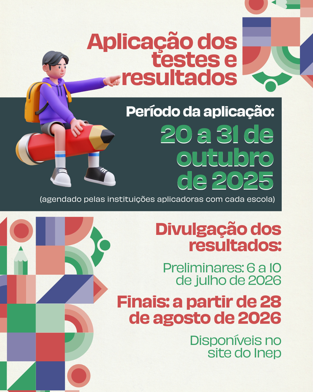 Os resultados preliminares (6 a 10/7/2026) e finais (a partir de 28/8/2026) serão disponibilizados no site do Inep (Instituto Nacional de Estudos e Pesquisas Educacionais Anísio Teixeira)