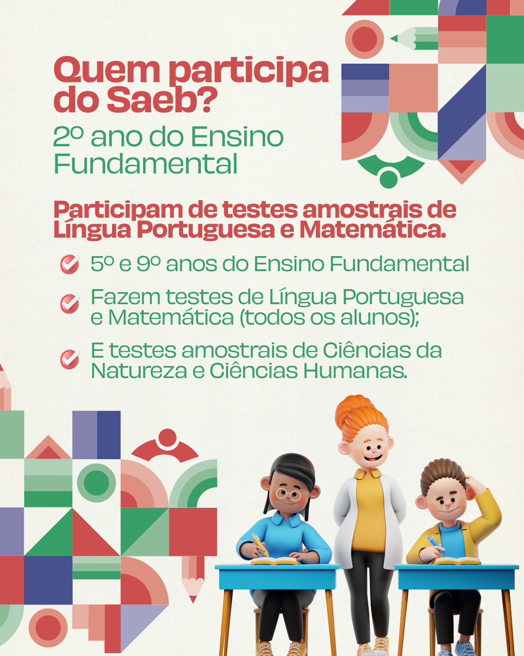 O Sistema de Avaliação da Educação Básica (Saeb) é um conjunto de avaliações externas que têm o objetivo de traçar um diagnóstico da Educação brasileira e dos níveis de aprendizagem dos alunos. Participam da avaliação alunos do 2º, 5º e 9º ano do Fundamental.