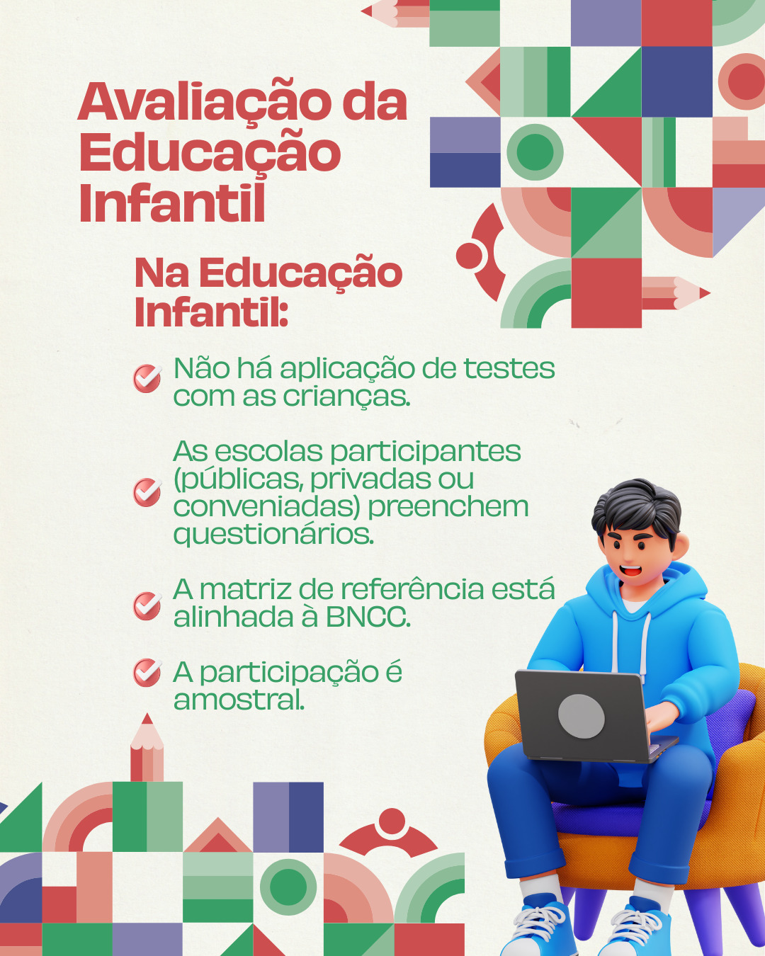 Na Educação Infantil, não há testes com as crianças, mas as unidades preenchem questionários. O objetivo é avaliar a Educação Infantil em escolas públicas, privadas e conveniadas. A participação das escolas é amostral e a matriz de referência é alinhada à BNCC (Base Nacional Comum Curricular).